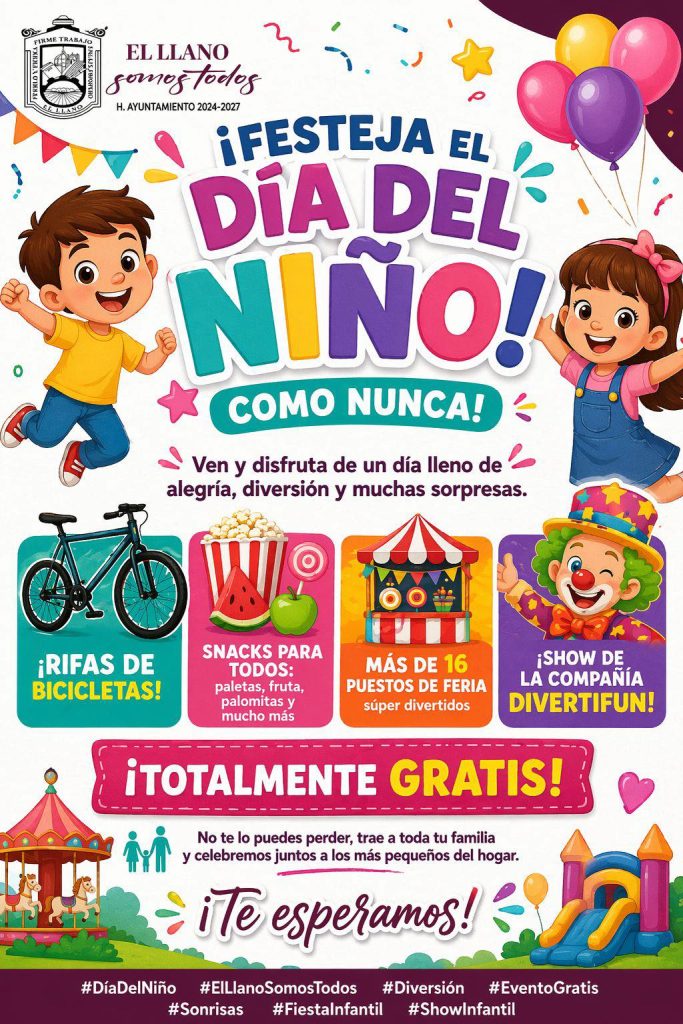 La Presidencia Municipal de El Llano, Aguascalientes invita cordialmente a todas las familias a festejar el Día del Niño con un evento lleno de alegría, sorpresas y diversión.